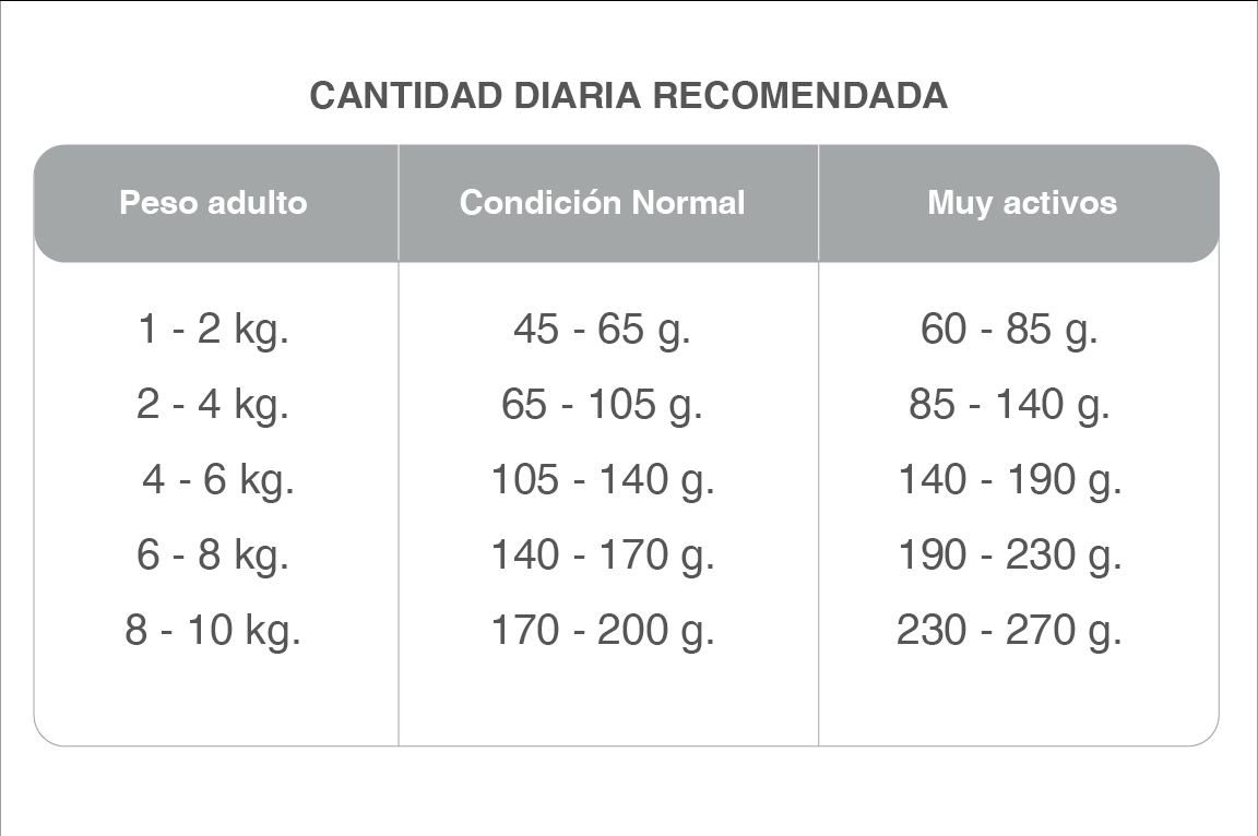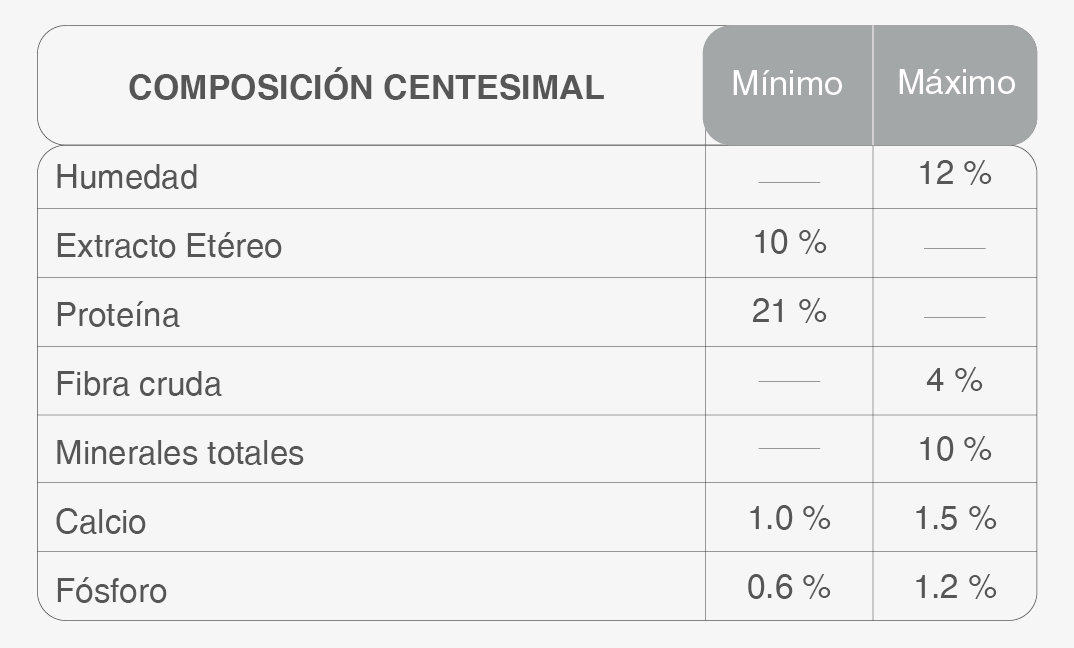 Harina de carne, harina de pollo, trigo, maíz, gluten de maíz, germen de maíz, harina de soja, aceite de pollo, levadura de cerveza, aceite de pescado (fuente de omega 3 y 6), hidrolizado proteico de pollo, carbonato de calcio, sal yodada, cloruro de potasio, zeolita, extracto de yucca schidigera, ácido cítrico, tocoferoles, dipropionato de amonio, ácido propiónico; núcleo vitamínico-mineral: vitaminas: A, D3, E, K, B1, B2, B6, B12, ácido fólico, ácido nicotínico, ácido pantoténico, biotina, colina; minerales: zinc, hierro, cobre, yodo, manganeso, selenio.