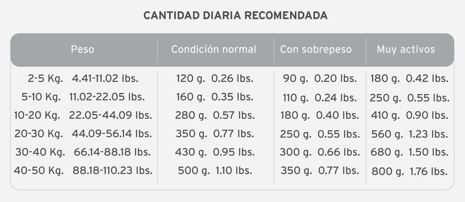 Harina de carne vacuna, harina de pollo, trigo, maíz, gluten de maíz, germen de maíz, harina de soja, aceite de pollo, levadura de cerveza, aceite de pescado (fuente de omega 3 y 6), hidrolizado proteico de pollo, carbonato de calcio, sal yodada, cloruro de potasio, zeolita, extracto de yucca schidigera, ácido cítrico, tocoferoles, dipropionato de amonio, ácido propiónico; núcleo vitamínico-mineral: vitaminas: A, D3, E, K, B1, B2, B6, B12, ácido fólico, ácido nicotínico, ácido pantoténico, biotina, colina; minerales: zinc, hierro, cobre, yodo, manganeso, selenio.