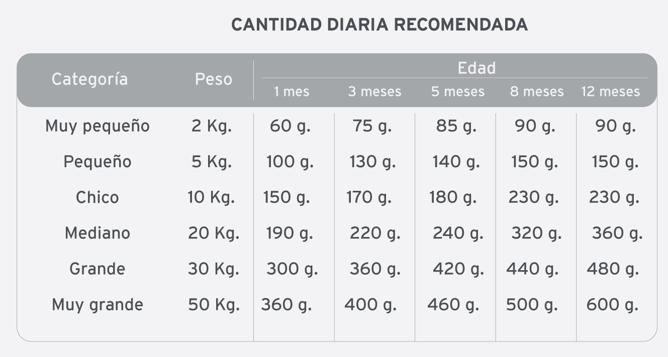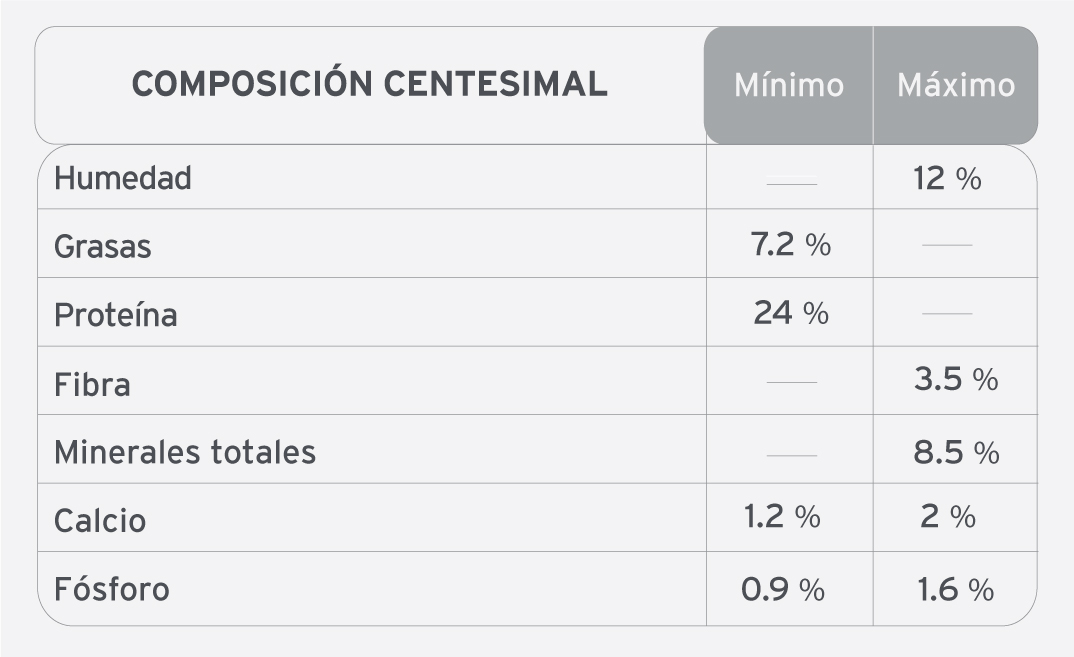 Harina de carne vacuna, harina de pollo, trigo, maíz, gluten de maíz, germen de maíz, harina de soja, aceite de pollo, levadura de cerveza, aceite de pescado (fuente de omega 3 y 6), hidrolizado proteico de pollo, carbonato de calcio, sal yodada, cloruro de potasio, zeolita, extracto de yucca schidigera, ácido cítrico, tocoferoles, dipropionato de amonio, ácido propiónico; núcleo vitamínico-mineral: vitaminas: A, D3, E, K, B1, B2, B6, B12, ácido fólico, ácido nicotínico, ácido pantoténico, biotina, colina; minerales: zinc, hierro, cobre, yodo, manganeso, selenio.