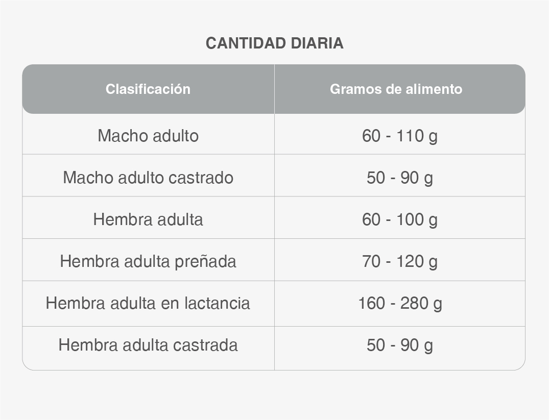 Harina de pescado, harina de pollo, harina de carne vacuna, arroz, gluten de maíz, maíz, arveja, aceite de pollo, aceite de pescado (fuente de omega 3 y 6), huevo en polvo, plasma bovino en polvo, pulpa de remolacha (fuente de fructo-oligosacáridos FOS), levadura de cerveza, hidrolizado proteico de menudencias porcinas, zeolita, sal yodada, fibra insoluble (celulosa), acidificante en polvo (bisulfato ácido de sodio), metionina, lisina, taurina, extracto de yucca schidigera, ácido cítrico, tocoferoles, extracto de romero, dipropionato de amonio, ácido propionico, núcleo vitamínico-mineral; vitaminas A, D3, E, K, B1, B2, B6, B12, ácido fólico, ácido nicotínico, ácido pantotenico, biotina, colina, minerales; zinc, hierro, cobre, yodo, manganeso y selenio.